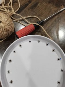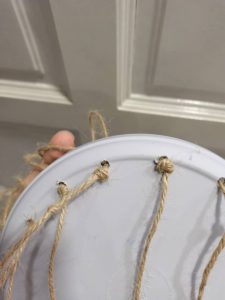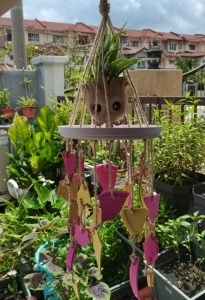 And so began the project of upgrading it into a perfectly imperfect windchime/plant holder! I wasn’t too sure about where the idea came from or if it would even turn out successful, but I collected a few more broken plates from somebody else, and didn’t look back. I used a hammer to further break my cracked plates into smaller pieces, and heated screwdriver to melt little holes into them. I used some leftover string I had lying around the house to tie everything together and voila!